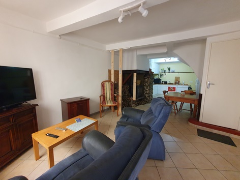 floor : lounge with a fireplace and a woodstove « Gaudin », fitted kitchen,
